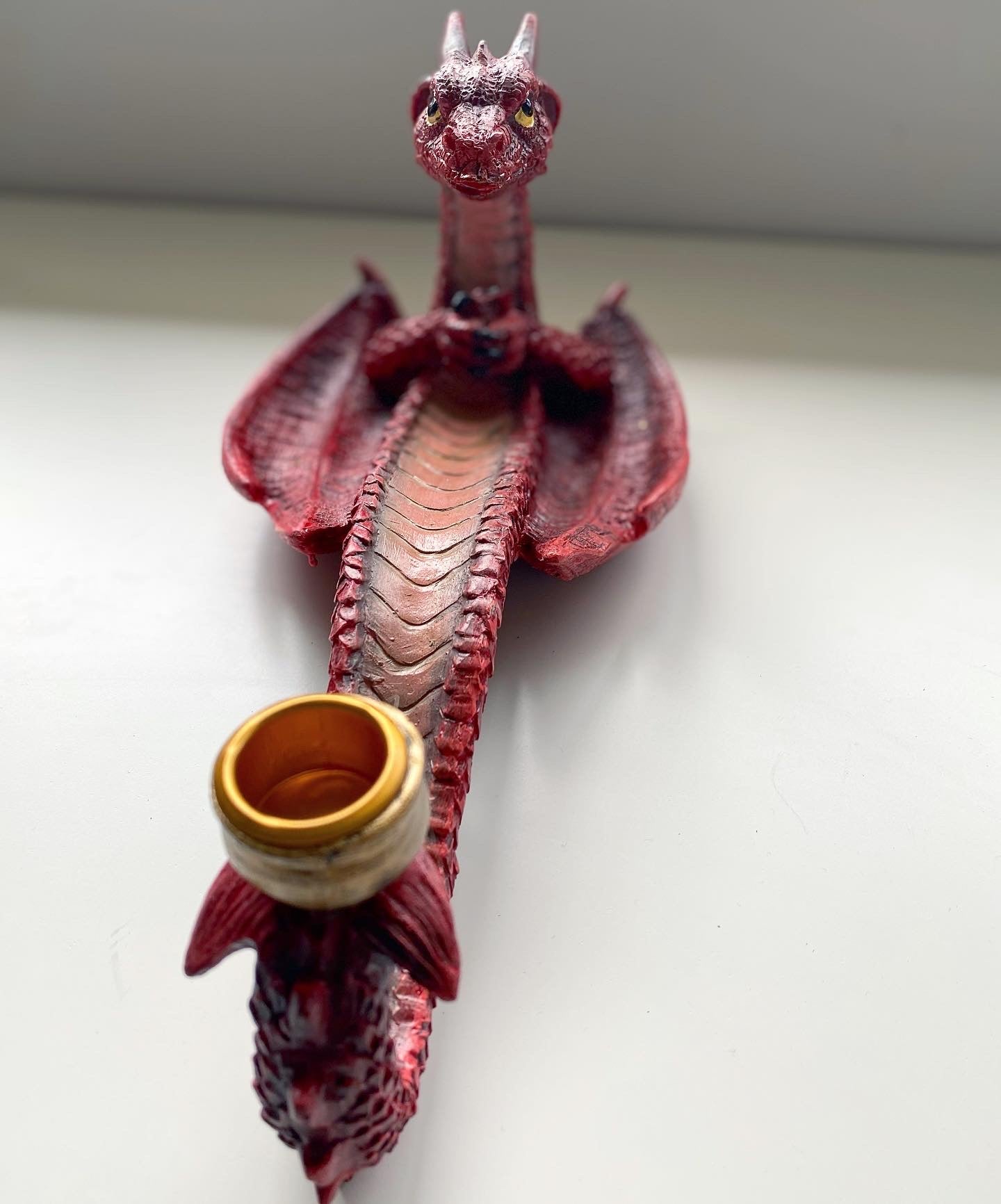 Fill your room with the subtle scent of your choosing with this mystical dragon incense burner. This collectable red dragon 🐉 is beautiful piece for dragon lovers, working well as an incense stick burner located in his arms and a cone / pillar candle holder featured at the tip of his tail.